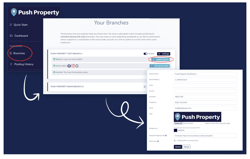 When you connect your CRM we will pull in all your properties and create all of your branches. The details we hold will be based on the information your CRM provider sends. It is important that this branch information is current and up to date.